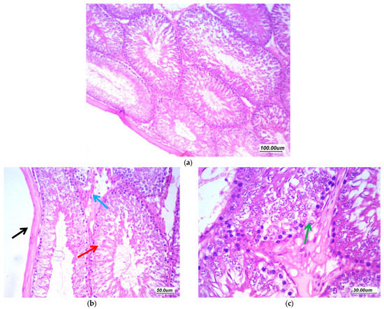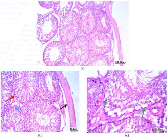 A score from 1 to 10 was given, according to the presence or absence of germ cells [31]. SNT diameter was measured at 200× magnifications; besides, the epithelium thickness was assessed at 400× magnification using the light microscope. After selection, rounded tubules were cut transversely and the average of tubule diameters was calculated depending on two spans of each tubule, one vertical to the other [16]. For the measurements in oblique sections, the minor axis was taken [32,33].