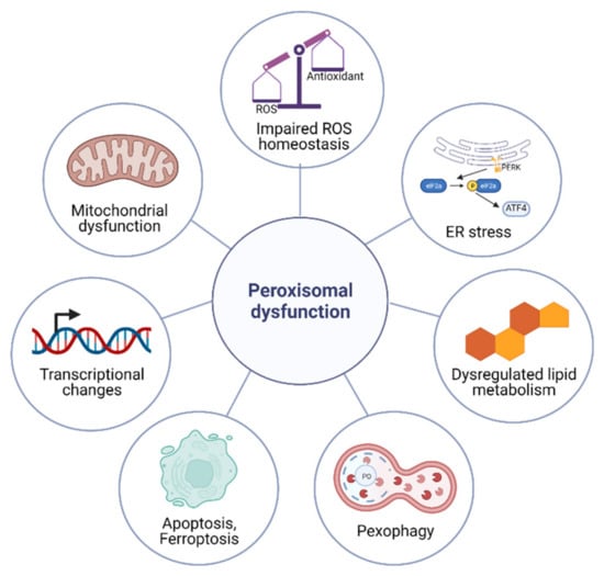 Given the essential roles of peroxisomes in cellular and metabolic homeostasis [,], it is not surprising to find that peroxisomal dysfunction is strongly linked to the loss of redox homeostasis, dysregulated lipid metabolism, mitochondrial dysfunction, altered gene expression, and elevated ER stress and cell death. More recently, it has become clear that peroxisome deficiency can also alter functions of specific subcellular organelles [,,], such as mitochondria, endoplasmic reticulum (ER), and lysosome. Peroxisomal stress signals can also be transduced from peroxisomes to the nucleus, as peroxisomal dysfunction often induces global transcriptional changes [,]. Thus, similar to other organelle stress pathways (e.g., ER stress), there are specific peroxisomal stress response pathways that allow eukaryotic cells to cope with malfunctioning peroxisomes [].