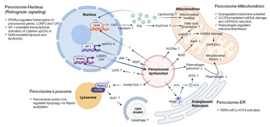 Peroxisomes are multifunctional and dynamic organelles that actively contribute to cellular signaling, cell fate, immunity and inflammation, and aging []. To accomplish these cellular activities, peroxisomes interact and coordinate with other subcellular organelles, such as mitochondria, ER, lysosomes, and lipid droplets [,,]. The cellular changes that accompany peroxisomal dysfunction, discussed in Section 4, are strongly associated with peroxisome-organelle crosstalk. In this section, we summarize the current knowledge on peroxisome-organelle communication involving membrane contact sites, peroxisome-derived signaling metabolites, and retrograde signaling (Figure 2 and Figure 3). In addition, we highlight some of the potential mechanisms by which inter-organelle communication contributes to peroxisomal stress responses.