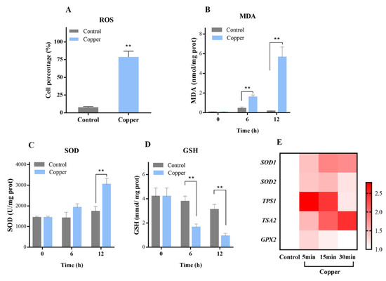 The distinct oxidative stresses induced by copper: (A) the effect of copper on ROS levels in S. cerevisiae; (B) the effect of copper on MDA levels in S. cerevisiae; (C) the effect of copper on SOD activity in S. cerevisiae; (D) the effect of copper on GSH content in S. cerevisiae; and (E) the transcription levels of genes involved in the oxidative stress response. ** p < 0.01.
