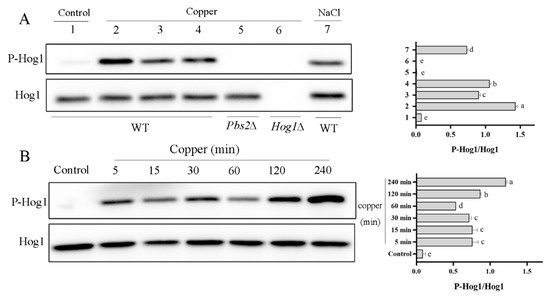 Numerous studies have shown that the HOG pathway plays a role in oxidative stress resistance [16,17]. Considering that copper can distinctly induce oxidative stress, we further assessed whether the HOG pathway could be activated under copper exposure. First, we studied the growth patterns of WT, Pbs2∆, and Hog1∆ strains (both with and without copper exposure) by spotting cells in YPD media. As shown in Figure 2A, the Pbs2∆ and Hog1∆ strains were found to be more sensitive than the WT cells upon copper exposure, with significant growth reductions. Similar results were obtained when the growth experiment was performed using a liquid medium (Figure 2B).