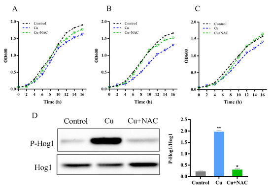 Oxidative stress is essential for the activation of Hog1: the sensitivity of WT, Pbs2∆, and Hog1∆ strains to copper were suppressed by NAC addition (A–C); (D) the addition of NAC reduced Hog1 phosphorylation under copper exposure. * p < 0.05, ** p < 0.01.
