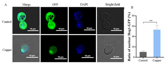 It has been suggested that most of the activated Hog1 is rapidly translocated from the cytoplasm to the nucleus to stimulate the activity of several transcription factors and to regulate gene expression [36]. Therefore, in this study, the localization of Hog1 was measured using GFP-tagged Hog1–GFP fusion protein in WT strains after treatment with CuSO4. As shown in Figure 5, the ratio of nuclear Hog1–GFP (%) under the control conditions was 10.30%, indicating that Hog1 was mainly in the cytoplasm under control conditions. However, following treatment with 4 mM CuSO4, this percentage increased to 53.20%, suggesting that the Hog1–GFP fusion protein displayed a significant nuclear localization under copper exposure. Nuclear localization is necessary for Hog1 to phosphorylate its nuclear substrates, including transcription factors and cell-cycle regulators [36,37]. Taken together, these findings (shown in Figure 3 and Figure 5) suggest that the HOG pathway is activated in response to copper toxicity in S. cerevisiae.