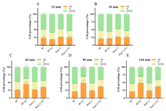 The proportion of log-phase cells (WT and Hog1Δ) in the G1, S, or G2/M phases of the cell cycle based on flow cytometric analysis grown in YPD with 4 mM CuSO4. DNA content was measured at the indicated time points (A) 15 min, (B) 30 min, (C) 60 min, (D) 90 min, and (E) 120 min. The error bars represent standard deviations, and 50,000 events were acquired in each analysis.