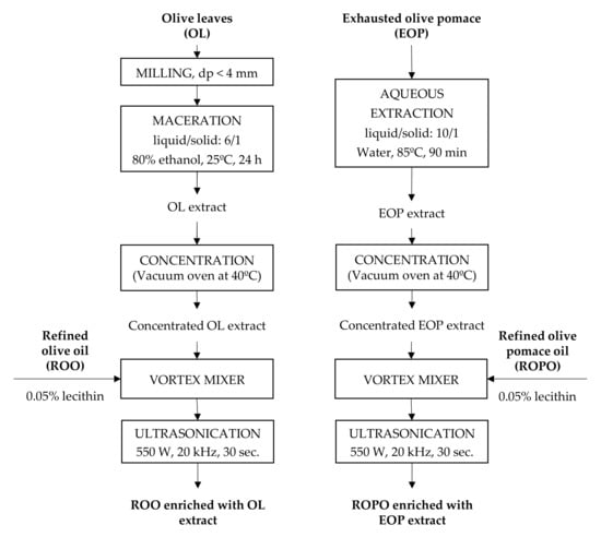 Oleuropein-rich OLs and hydroxytyrosol-rich EOP were used to obtain antioxidant extracts. These extracts were used for enriching ROO and ROPO, respectively.