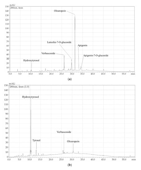 Chromatograms and characterized compounds in the concentrated extract of (a) olive leaves and (b) exhausted olive pomace.
