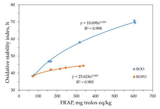 The OSIs of ROO and ROPO were highly correlated with their antioxidant capacities measured using the FRAP and DPPH methods. The relationship between the OSIs and the antioxidant capacities measured using the FRAP method for ROO and ROPO is illustrated in Figure 3. Franco et al. [31] demonstrated that the oxidative stability of virgin olive oil depended on its antioxidant capacity. Therefore, it can be concluded that these parameters are reliable for estimating the useful life of oils. The oxidative stabilities of the extract-enriched oils equaled or exceeded those of the commercial oils. In particular, the OSI of the ROO enriched with 0.5 g/L of OL extract (ROO-0.5) (45.83 h) was similar to that of a commercial ROO (46.81 h) (Table 3).