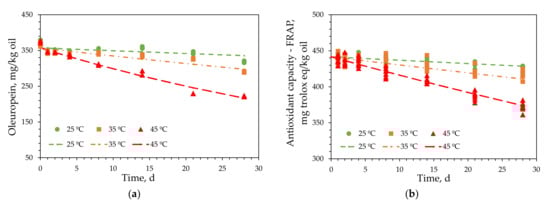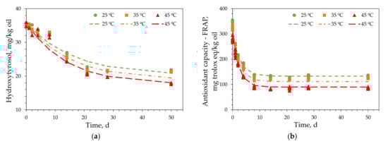 The kinetic analysis of the ROPO enriched with 2 g/L of EOP extract (ROPO-2.0) was also performed using samples stored at 25, 35, and 45 °C. For these experiments, hydroxytyrosol was considered to be the primary phenolic compound in the oil. The experiments for the kinetic study of the hydroxytyrosol content were performed in duplicate, and the results are presented in Figure 6a. Moreover, the antioxidant capacities determined using the FRAP and DPPH methods were determined in triplicate, and the results are illustrated in Figure 6b.