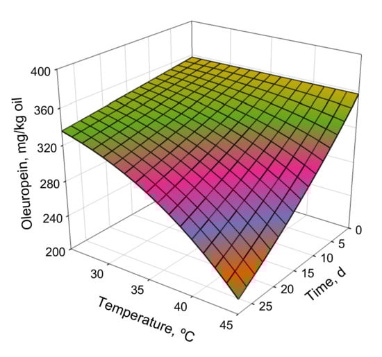 The response surface for the oleuropein kinetic model is presented in Figure 3. At low temperatures, the changes in response with time were negligible; however, they increased significantly at higher temperatures. This confirmed that the kinetic process depended significantly on temperature, as suggested by the high Ea values in Table 4. Therefore, the data in Table 4 and Figure 4a and Figure 5 indicate that the reaction kinetics depended significantly on temperature, since the reaction was very slow at low temperatures and increased rapidly with increasing temperature. The response surfaces for the antioxidant capacities, determined using the FRAP and DPPH methods, were similar to that illustrated in Figure 5. Therefore, the similar behaviors of the three responses to temperature indicated that the antioxidant capacities of the enriched olive oils varied proportionally with their oleuropein contents.