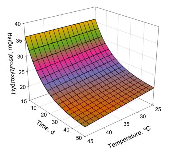 The response surface for the kinetic model used for the hydroxytyrosol content is presented in Figure 7. The asymptotic tendencies toward minimum values at each temperature are also illustrated in Figure 7. Moreover, the plot in Figure 7 illustrates that the main factor that affected the response was time. These findings were supported by the small changes in the kinetic constants with temperature (Table 5). The degradation kinetics of hydroxytyrosol were slow, as indicated by the kinetic constants. Hydroxytyrosol degradation occurred faster than oleuropein degradation; however, the hydroxytyrosol content tended toward a minimum value, which remained constant over time. Moreover, the antioxidant capacity followed a similar trend; it reached a minimum value, which remained constant over time. The minimum achievable values at each temperature are listed in Table 5.