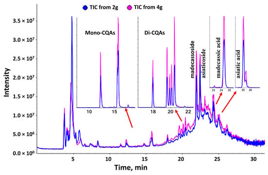 Total ion chromatogram (TIC) of Centella asiatica water extract product (CAP) showing peaks corresponding to the triterpene and caffeoylquinic acid components of interest. The total ion chromatogram in negative ion mode corresponds to 2 g (blue) and 4 g (pink) of the Centella asiatica water extract present in each sachet (~20 g). The major compounds are indicated in the chromatogram. Extracted ion chromatograms (XIC) are shown for the monocaffeoylquinic acids (mono-CQAs; m/z 353.08, [M-H]−), the dicaffeoylquinic acids (Di-CQA, m/z 515.12, [M-H]−), madecassic acid (m/z 503.3, [M-H]−), and asiatic acid (m/z 487.3, [M-H]−).