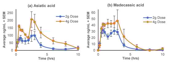 The maximum plasma concentration (Cmax) was greater for asiatic acid (124 and 259 ng/mL) than madecassic acid (38 and 63 ng/mL) at both the 2 g and 4 g doses, respectively. This was to be expected, as there was more asiaticoside than madecassoside in the initial plant material and the standardized study product CAP (Table 1). There was a nearly 2-fold increase in Cmax and AUC(0–10) between the 2 g and 4 g doses for both aglycones, consistent with the 2-fold increase in amount of CAW consumed. This suggests that the maximum absorbable amount of the aglycones is at or above 4 g CAW daily, otherwise there would have been a non-significant difference between the two doses. The dose-dependent response found in this study is in contrast with a recent study by Songvut et al. [65] using two doses of purified TTs (modified ECa233) (250 mg and 500 mg). They found a slight increase in the Cmax and AUC for asiatic acid and a minimal increase for madecassic acid with single dosing but a much more significant increase with repeat dosing over seven days, despite a short half-life [42]. It is hypothesized that this is a result of gradual metabolism of asiaticoside from preceding doses, due to delayed absorption or metabolism.