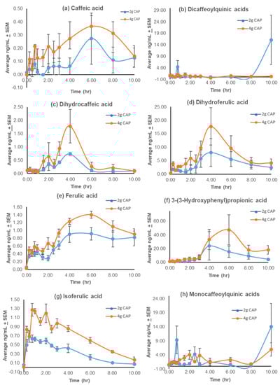 The metabolism of CQAs to caffeic and ferulic acid derivatives [74,75,76,77], as well as to ethyl, methyl, and vinyl catechols [78], by gastrointestinal microflora, and Phase I and II metabolism is well documented. Our data shows that many of these putative CQA metabolites are detectable in human plasma after oral CQA administration in concentrations ranging from 0.3–32 ng/mL for 2 g of CAP and 1–42 ng/mL for 4 g of CAP (Table 3). The concentration-time profiles (Figure 5) do not reveal a distinct bimodal distribution as with the TTs, but rather a small preliminary peak and a more delayed, larger single peak (Tmax) ranging from 1.3–6 h. These findings support the previous pharmacokinetic studies on CQAs derived from coffee [76] and artichoke extracts [79]. Scherbel et al. [80] reported the pharmacokinetic parameters of mono-CQAs and various metabolite groups listed previously following coffee intake, emphasizing the significant variation between subjects. Peak plasma levels were rapidly attained for the mono-CQAs and hydroxycinnamic acid metabolites (tmax ≤ 1 h), signifying absorption before reaching the lower intestinal tract, while the hydroxycinnamates’ dihydro metabolites reached peak levels significantly later (5.5–8.5 h), supporting their formation between the jejunum and colon. This suggests that the wide range in Tmax observed with CAP could be due, in part, to the site in which the compounds are generated, and the small bimodal distribution could also be attributed to enterohepatic circulation [81].