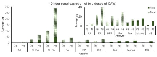 The parent compounds asiaticoside, madecassoside, and dicaffeoylquinic acids were not detected in the screening or baseline urine (Table 4); however, small amounts of madecassoside were detected in the 10 h renal excretion of both 2 g and 4 g CAP in a predominantly free form (Figure 6). Monocaffeoylquinic acids were detected in the screening urine and the post-administration urine, predominantly in the free form but not in the baseline urine. There was a decrease in mono-CQAs in the baseline urine following the low phytochemical diet compared to screening urine; however, it did not reach significance (p = 0.1). Asiatic acid and madecassic acid were found in very low concentrations in screening urine, were absent in baseline urine (Table 4), and were found in very low concentrations following consumption of CAP (Figure 6). Madecassic acid was predominantly found in the free form, while asiatic acid was predominantly in the conjugated form. The putative CQA metabolites caffeic acid, dihydrocaffeic acid, dihydroferulic acid, ferulic acid, 3-(3-hydroxyphenyl)propionic acid, and isoferulic acid were detected in the screening urine, in a predominantly unconjugated form, and in the post-administration urine for both doses, in a predominantly conjugated form (Table 4, Figure 6). There was a significant decrease in the amounts of caffeic acid, dihydrocaffeic acid, ferulic acid, 3-(3-hydroxyphenyl)propionic acid, and isoferulic acid with the low phytochemical diet (Table 4). However, there were no significant differences in the renal excretion of any parent compounds or putative metabolites between 2 g and 4 g CAP over 10 h (p = 0.09–0.89).