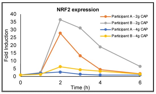 NRF2 gene expression was detected in the PBMCs of both participants where this was measured and showed a paradoxical, dose-dependent, temporal profile with peak expression occurring at 2 h after CAP administration and returning to near baseline levels by 6 h (Figure 7). The profile mirrors the pharmacokinetic profile for asiatic acid in which the Tmax occurred at 2 h; however, the relative induction of NRF2 gene expression for each dose does not correspond with the observed dose dependent increase in Cmax for asiatic acid.