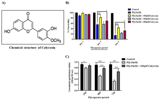 Following a similar exposure régime, we fed 3–5-day-old adult flies with 5% sucrose solution as a control and 5 mM PQ alone or with different calycosin concentrations (0.0, 100.0, 200.0 and 400.0 µM) diluted in 5% sucrose solution on filter paper through ingestion until all flies were dead. The counting of surviving flies was performed every 24 h post-exposure, and we plotted the survival percentage graphs on days 1, 3, and 5 of PQ co-exposure with different feeding concentrations of calycosin (Figure 1). The data show that PQ with 5 mM exposure gradually significantly increase the mortality of flies, with an average of 35% and 78% on days 3 and 5, respectively. Further, we screened different concentrations and time periods of calycosin treatment and chose the 100 µM calycosin concentration for the study, as it shows maximal protection in the fly survival assays against PQ-induced toxicity. Interestingly, co-exposure of calycosin provides significant (p < 0.001) protection against PQ-induced toxicity, with 41% of flies surviving on day 5, compared with 22% survival being observed for PQ-exposed flies. We also performed an additional survival experiment wherein adult male flies were fed with a different concentration of calycosin (100 µM, 200 µM, and 400 µM) after 24 h, 48 h, and 72 h post PQ treatment in 5.0% sucrose solution on filter paper and check the survivality until all of the flies were dead (Figure S1). The results suggested that calycosin could also improve survival of flies pretreated with PQ and confirm that calycosin appears to be a potential protective candidate against PQ-induce neurotoxicity in flies.