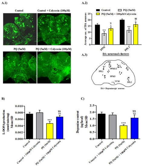 Calycosin suppresses dopaminergic neuron loss in PQ-exposed Canton S flies. (A.1) Representative confocal imaging was used to detect specific DA neuron clusters in the control flies and the flies exposed to 5 mM PQ or with PQ (5 mM) + 100 µM calycosin for 48 h. Anti-Drosophila tyrosine hydroxylase antibody was used to detect the specific DA neuronal clusters in the Drosophila brain. White and red arrows indicate the PPL and PPM DA neuron clusters, respectively. Scale bars—100 µm. (A.2) Graph showing the average number of DA neuron clusters in the control flies and the flies exposed to 5 mM PQ or with PQ (5 mM) + 100 µM calycosin for 48 h. (A.3) Schematic diagram of different DA neuron clusters. (B,C) Graph showing the Dopamine (DA) and L-DOPA production in control and 5 mM PQ or with PQ (5 mM) + 100 µM calycosin exposed flies for 48 h. Data presented are mean ± SD (n = 3). Significance ascribed as * = p < 0.05, ** = p < 0.01 and *** = p < 0.001 vs. control and $ = p < 0.05 and $$ = p < 0.01 vs. PQ (5 mM) exposure. DA, dopaminergic; PQ, paraquat; SD, standard deviation.