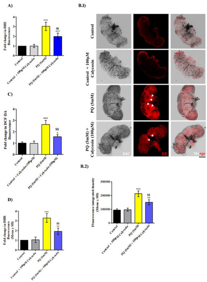 Calycosin supplements resist PQ-induced higher ROS levels. Graphical representation of ROS levels using quantitative measurement of DHE (A), DCF-DA (B) and DHR’s (C) fluorescence intensity in the control (D), 5 mM PQ and with PQ (5 mM) + 100 µM calycosin-exposed flies for 48 h. (B.1) Representative confocal imaging showing DHE oxidation level in live brain tissues from the control, 5 mM PQ, and with PQ (5 mM) + 100 µM calycosin-exposed flies and (B.2) graphs showing DHE fluorescence integrated density in control and exposed fly groups. Data presented are mean ± SD (n = 3). Significance ascribed as * = p < 0.05, ** = p < 0.01 and *** = p < 0.001 vs. control and $$ = p < 0.01 vs. PQ (5 mM) exposure. DHE, dihydroethidium; DCF-DA, 2’,7’-dichlorodihydrofluorescein diacetate; DHR, dihydrorhodamine; PQ, paraquat; SD, standard deviation. Scale bars—100 µm.