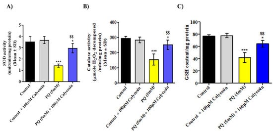 All assays were carried out three times with three independent biological replicates. Data were expressed as mean ± SD. Mean values of the data were statistically calculated by Graph Pad Prism software 5.0 (Graph Pad Inc., San Diego, CA, USA). Significant differences between mean values were analyzed by one-way ANOVA followed by Tukey’s post hoc test, and significance was represented by * p < 0.05, ** p < 0.01, *** p < 0.001 when compared with control flies and $ p < 0.05, $$ p < 0.01, $$$ p < 0.001 when compared to the PQ (5 mM)-exposed group.