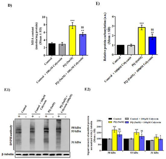 Furthermore, we monitored oxidative stress-responsive enzymes’ activity: SOD and CAT were significantly reduced in PQ-exposed flies after 48 h, and the same were significantly higher in calycosin-fed PQ-exposed flies compared with PQ alone-exposed flies (Figure 4A,B). Since O2−. is a substrate of SOD activity, it can be assumed that higher O2−. formation may lead to the induction of higher SOD activity in PQ-exposed flies. Interestingly, decreased SOD activity was observed in PQ-exposed flies, which may be due to higher ONOO− formation in cells causing the nitration of SOD, which leads to the moderation of its activity. Along with the reduced ROS generation and higher SOD and CAT activity observed in calycosin-fed PQ-exposed flies, a significantly lower depletion of GSH content (~26%) and decrease in MDA (~33%) and PCC content (~29%) were found in their brain tissues as compared with similarly PQ-exposed flies (Figure 4C,D). The level of oxidatively modified proteins (using a DNP-specific antibody) in PQ-exposed flies shows a significantly higher DNP-specific signal intensity (at ~58 kDa, ~53 kDa and ~31 kDa), whereas a lower intensity was observed in calycosin-fed PQ-exposed flies as compared to similarly PQ-exposed flies. Therefore, treatments of calycosin administered to the PQ-exposed flies seems to have offered protection against neuronal cell damage due to lower levels of ROS generation and oxidative stress.