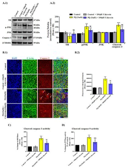 For the examination of caspase-3 expression in neuronal cells of unexposed and PQ-exposed groups fed with or without calycosin (100 µM), dissected brain tissues (~10 nos.) were fixed as described above (please see Section 2.6) and stained with cleaved caspase-3 primary antibody (1:100) and an appropriate secondary antibody (1:400). After that, samples were stained with Alexa Fluor 488® phalloidin (1:200; Catalog number: A12379; Invitrogen) for 5 min in the dark at 25 ± 2 °C, and then were mounted with Vectashield mounting media (Vector Laboratories, Germany) for 10 min at room temperature. Finally, images were processed using a confocal laser scanning fluorescence microscope (Leica TCS-SPE Microsystems, Wetzlar, Germany) with 63X objective, focusing on a specific lobe of each brain.