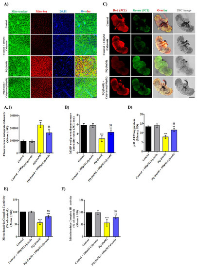 We employed the membrane-permeant JC-1 dye (5,5′,6,6′-tetrachloro-1,1′,3,3′-tetraethyl–benzimidazolyl-carbocyanine iodide) (Catalogue no: M34152; Invitrogen, Carlsbad, CA, USA) to measure membrane potential in homogenized head samples from unexposed and PQ-exposed groups fed with or without calycosin (100 µM) according to the published method of Wang et al. [52]. Briefly, 30 heads were homogenized in chilled isolation buffer (5 mM Tris-HCl, 2 mM EGTA and 250 mM sucrose, pH 7.4), and differential centrifugation followed (200× g for 5 min and 10,000× g for 10 min) at 4 °C. Next, isolated mitochondria were resuspended in Tris-EDTA buffer (50 mM Tris-Cl + 0.1 mM EDTA (pH 7.4)). To measure MMP in homogenized samples, isolated mitochondrial fractions were incubated with 2 µM JC-1 dye for 10 min at room temperature. Finally, absorbance was taken first at 410 and 529 nm excitation and emission wavelengths, respectively, and after that, at 410/590-nm excitation and emission wavelengths, respectively. The MMP fluorescence intensity was calculated by taking the ratio of emission wavelengths at 590 nm to the 529 nm.