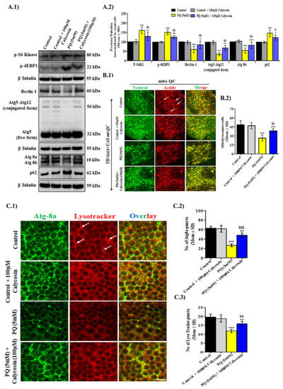 Whole brains were dissected from unexposed and PQ-exposed groups fed with or without calycosin (100 µM) fixed as described above (please see Section 2.6), and immunostained with Atg8a primary antibody (1:100) and an appropriate secondary antibody (1:400). Next, samples were stained with 0.5 µM of Lysotracker RED DND-99 (Catalog number: L7528; Invitrogen, Carlsbad, CA, USA) for 5 min in the dark at 25 ± 2 °C, and then were mounted with Vectashield mounting media (Vector Laboratories, Germany) at room temperature for 10 min. Finally, images were processed using a confocal fluorescence microscope (Leica TCS-SPE Microsystems, Wetzlar, Germany) with 63X objective, focusing on a specific lobe of each brain.