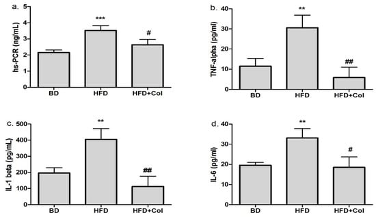Colchicine effects on inflammation biomarkers levels: BD—basic diet; HFD—high-fat diet; HFD + Col—high-fat diet and colchicine; (a) high sensitivity reactive protein C (hs-PCR), (b) tumor necrosis factor-alpha (TNF-alpha), (c) interleukine-1 beta (IL-1 beta), (d) interleukine-6 (IL-6); ** p < 0.01; *** p < 0.001 HFD vs. BD group; # p < 0.05; ## p < 0.01 HFD + Col vs. HFD group.