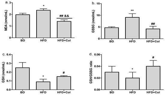 Colchicine effects on oxidative stress biomarkers: BD—basic diet; HFD—high-fat diet; HFD + Col—high-fat diet and colchicine; (a) malondialdehyde (MDA), (b) reduced glutathione (GSH), (c) oxidized gluthatione (GSSG), (d) GSH/GSSG ratio; * p < 0.05; ** p < 0.01 HFD vs. BD; # p < 0.05; ## p < 0.01 HFD + Col vs. HFD; && p < 0.01 HFD + Col vs. BD group.