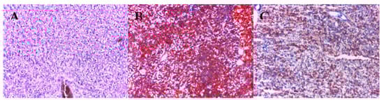 Colchicine effects on liver sections stained with Red Oil (200×). The fat infiltration in the hepatic cells is indicated by the red coloration: (A) WT + BD; (B) WT + HFD; (C) WT + HFD + Col; BD—basic diet; HFD—high-fat diet; HFD + Col—high-fat diet and colchicine.