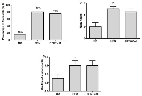 The NAFLD (non-alcoholic fatty liver disease) activity score (NAS) was established based on histological features (steatosis, lobular inflammation, hepatocyte ballooning). The NAS score markedly increased (p < 0.01) in the HFD group compared to the BD group, while colchicine administration did not produce statistically significant changes in the NAS score (Figure 6b). The degree of steatohepatitis was mild in BD groups, and moderate in the HFD group (p < 0.05), whereas administration with colchicine did not produce changes regarding the steatohepatitis grading when compared to the HFD group (Figure 6c).