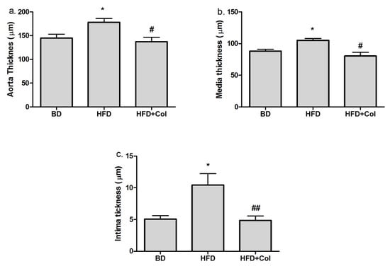 Colchicine effects on aortic histopathological sections: (a) aorta tickness, (b) media tickness, (c) intima thickness. BD—basic diet; HFD—high-fat diet; HFD + Col—high-fat diet and colchicine; * p < 0.05 HFD vs. BD; # p < 0.05; ## p < 0.01 HFD + Col vs. BD.