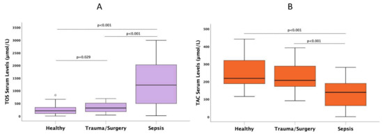 Serum median levels of (A) total oxidative stress (TOS) and (B) total antioxidant capacity (TAC) in septic patients in comparison to patients with non-infectious (trauma/surgery) and healthy controls. The bold black line in box plots indicates the median per group, the bottom of the box indicates the 25th percentile, and the top of the box represents the 75th percentile; the T-bars (whiskers) and horizontal lines show minimum and maximum values of the calculated non-outlier values. Connectors indicate significantly higher levels in sepsis (post hoc Dunn’s pairwise tests with Bonferroni corrections).