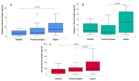Boxplots of serum median levels of (A) apoptotic caspase-9 (intrinsic pathway inducible caspase), (B) caspase-3 (effector caspase), (C) survivin (antiapoptotic protein) in septic patients in comparison to patients with non-infectious critical illness (trauma/surgery) and healthy controls. The bold black line in box plots indicates the median per group, the bottom of the box indicates the 25th percentile and the top of the box represents the 75th percentile; the T-bars (whiskers) and horizontal lines show minimum and maximum values of the calculated non-outlier values. Solid circles represent outliers, stars extremes. Connectors indicate significantly higher levels in sepsis (post hoc Dunn’s pairwise tests with Bonferroni corrections).