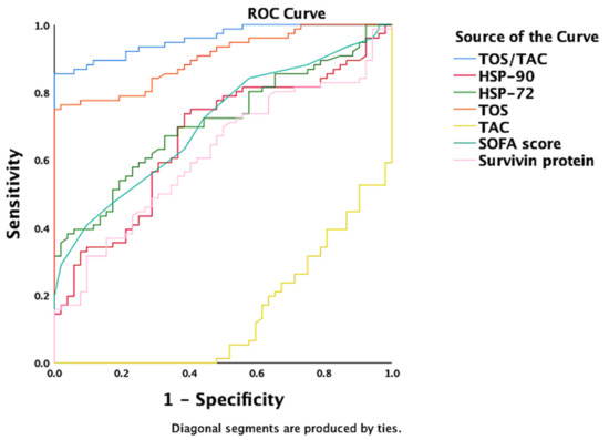 In an ROC analysis, TOS/TAC, TOS, Hsp72 and Hsp90, SOFA score, survivin protein, and repressed TAC were independent discriminators of sepsis (Figure 3). The TOS/TAC ratio achieved the best AUROC (0.96 (95% CI = 0.93–0.99), p < 0.001) (Table 4). Receiver operating characteristic curve analysis revealed that the area under the AUCTOS/TAC was significantly higher than AUCTAC (z = 20, p < 0.001) or AUCTOS (z = 3.1, p = 0.002) in distinguishing sepsis from control groups (including non-septic critical illness control and the healthy control). The optimal TOS/TAC cut off point value calculated by the Youden index (J) and confirmed by the Closest to (0,1) Criteria (ER) was 3.963 (sensitivity 85%, specificity 98%).
