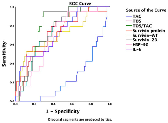 ROC curve for predicting mortality in septic patients. Independently, TAC (inverse prediction), TOS, survivin protein, IL-6, survivin transcript variants -2B and -WT (positive prediction) achieved significant receiver operating characteristic curves—AUROC of >0.70 (p < 0.004). The TOS/TAC ratio achieved the best AUROC (0.80, p < 0.001).