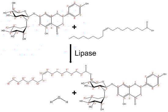 The esterification reaction can be carried out both chemically and enzymatically. However, the chemical method requires a high temperature and high pressure, which can affect the phenolic structure of flavonoids [4,11,12,13]. In addition, chemical esterification can produce byproducts such as isomers, owing to its low regioselectivity [12,13,14,15]. However, in an enzymatic reaction, owing to high regioselectivity, the reaction occurs only at a specific reaction site. With regard to the naringin esterification reaction, it has been reported that the reaction occurs only at the 6″-OH position of several OH groups (Figure 1) [16]. Therefore, the enzymatic reactions can minimize the formation of isomers due to chemo-, enantio-, and regio-selectivity; moreover, unlike chemical reactions that require high temperatures and high pressure, enzymatic reactions can be carried out under mild reaction conditions [17]. However, enzymes incur a higher cost than chemical methods, are less stable, and are difficult to separate, which translate to poor process applicability. To minimize these issues, immobilized enzymes are used, which have higher stability and higher durability than free enzymes and they can be applied to various reactions and processes owing to the easy separation involved and the possibility to reuse the enzymes [12,13,15,18,19].
