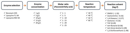 To find the optimal conditions for the enzymatic synthesis of naringin oleate, the following were manipulated in the stated order: enzyme type, enzyme concentration, molar ratio of the substrate, reaction temperature, and reaction solvent (Figure 2).