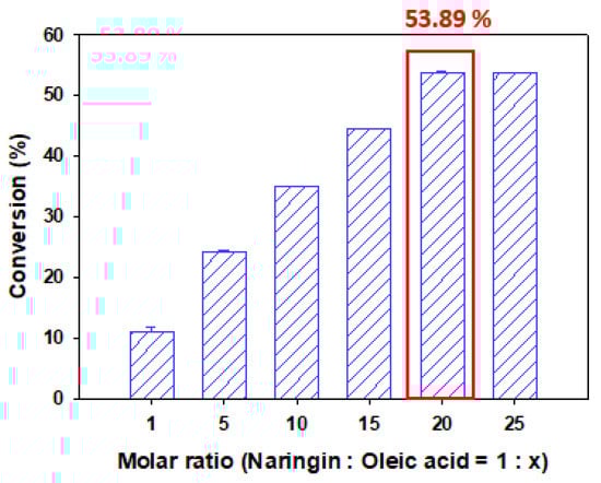 The theoretical molar ratio for reaction between naringin and oleic acid is 1:1. However, a high reaction rate can be achieved within a short period if an excessive number of reactants are used. Naringin shows low solubility in organic solvents, owing to its high hydrophilicity. Therefore, the concentration of oleic acid was changed to 1:1, 1:5, 1:10, 1:15, 1:20, and 1:25 against naringin. Conversion of 11.03%, 24.12%, 34.92%, 44.45%, 53.89%, and 53.74% were obtained, respectively (Figure 4). The conversion tended to increase with an increase in the amount of oleic acid to 1:20.