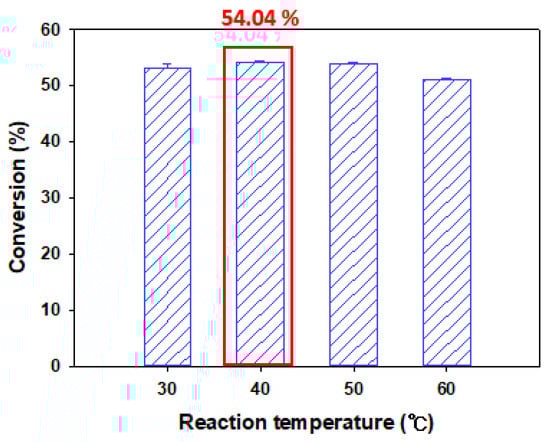 Reaction temperature has various effects on enzymatic reactions. Therefore, to investigate the effect of reaction temperature on naringin oleate synthesis, experiments were conducted using reaction temperatures of 30, 40, 50, and 60 °C. Conversion of 53.25%, 54.04%, 53.89%, and 50.99% were obtained, respectively (Figure 5). At a reaction temperature of 40 °C, the highest conversion of 54.04% was obtained, but there was no significant difference overall.