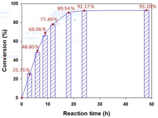 After completing the solvent selection step, experiments were conducted to determine the time to reach maximum conversion under optimal reaction conditions (Lipozyme TL IM 10 g/L, molar ratio 1:20, reaction temperature 40 °C, acetonitrile). Conversion of 25.75%, 48.00%, 66.06%, 77.49%, 89.54%, 92.17%, and 93.10% were obtained at 3 h, 6 h, 9 h, 12 h, 18 h, 24 h, and 48 h, respectively (Figure 6). The results show that conversion increased only 0.93% during the reaction time from 24 to 48 h and, therefore, that the reaction was completed within 48 h. This reaction time is shorter than that of previous studies.