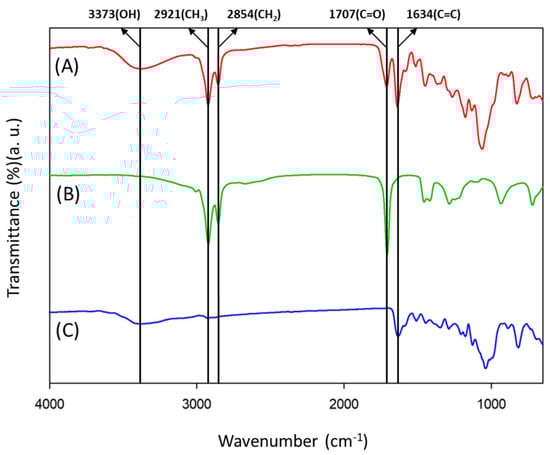 FT-IR analysis was performed, in the wavelength range of 650–4000 cm−1, to analyze naringin, oleic acid, and naringin oleate (Figure 7). The spectrum for naringin (C) showed a peak owing to the -OH functional group in the region of 3373 cm−1 and a peak indicating C=C bond at 1634 cm−1. In the oleic acid spectrum (B), distinguished peaks appeared at 2921 cm−1, 2854 cm−1, and 1707 cm−1 because of -CH3, -CH2-, and C=O, respectively. In the naringin oleate spectrum (A), presence of both naringin and oleic acid functional groups could be detected, confirming the synthesis of naringin oleate [51].