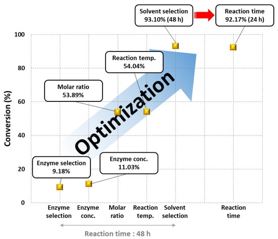 In this study, we evaluated the effect of each reaction parameter on the synthesis of naringin oleate by optimization using the OFAT method. Figure 8 summarizes the improvement in conversion by optimization of each parameter, affecting the synthesis of naringin oleate. Among the five parameters, molar ratio and solvent type had a significant effect on the synthesis of naringin oleate. When the molar ratio and solvent type were optimized, the conversion increased significantly from 11.04% to 53.89% and from 54.04% to 93.10%, respectively. Overall, the conversion significantly increased from 9.18% to 93.10% within 48 h by optimization of the naringin oleate synthesis reaction conditions. We further confirmed the conversion according to the reaction time under the optimal conditions, demonstrating a conversion of 92.17% obtained within 24 h. This study focused on the optimization of naringin oleate synthesis and a separation and a purification steps were performed. The purified product was confirmed using FT-IR, which confirmed that naringin oleate was synthesized. In the next stage, a statistical analysis will be conducted to determine the correlation of each reaction parameter based on these studies.