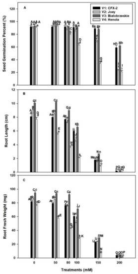 Three experiments were conducted as a completely randomized design and fifteen replicates with 10 seeds each were used for each treatment. All biochemical assays were repeated three times with five replicates on each seedling (n = 15) while forty-five replicates were used for morphological parameters (SGP, RL, and RFW). A two-way ANOVA was used to find differences between varieties and salt concentrations and their interactions. The means per plant were calculated and analysis of variance (SAS OnDemand for Academics) was carried out to separate these means by a protected least significant difference (LSD) at p < 0.05. The standard error (SE) of the mean was calculated.