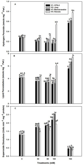 Lipid peroxidation is measured as MDA content, which is a marker of oxidative damage in a cell [27]. The rate of lipid peroxidation was higher (100 mM: 6 nmole g−1 Fwt.) in the roots of V4 at all the tested NaCl concentrations and coincided with higher levels (100 mM: 0.54 nmole g−1 Fwt.) of H2O2 (Figure 2A,B). However, the MDA content declined in V1 (3.1 nmole g−1 Fwt.) and V3 (3.2 nmole g−1 Fwt.) at 100 mM NaCl and coincided with lower levels of H2O2 (0.16 nmole g−1 Fwt.). In V2, the levels of MDA increased (3.7 nmole g−1 Fwt.) at 100 mM NaCl while the levels of H2O2 (0.22 nmole g−1 Fwt.) were low, which indicates the existence of enzymatic pathways of lipid peroxidation, independent of H2O2 levels.