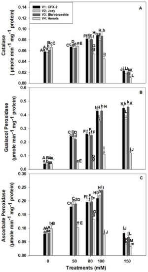 The CAT specific activity was significantly different in tested varieties in control conditions (Figure 3A). The maximum CAT specific activity (0.07 µmole min−1 mg−1 protein) was observed in V4 in control regimes. CAT specific activity increased in V1 (52%), V2 (39%), and V3 (43%) up to 100 mM NaCl and then declined at 150 mM. However, CAT specific activity slightly increased (3%) at 50 mM in V4, and then subsequently declined by 85% at 150 mM NaCl.