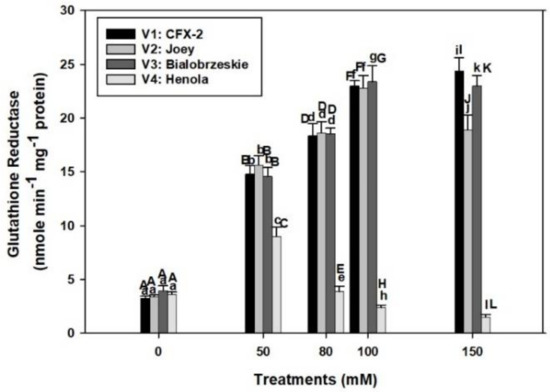 A new glutathione reductase gene (psgr) isolated from an Antarctic bacterium (Psychrobacter sp. ANT206) and cloned in Escherichia coli showed higher GR activity and confered salt tolerance up to 3 mM NaCl [84]. Among tested IH varieties, V1 and V3 showed improved root growth up to 100 mM NaCl in terms of better SGP, RL, RFW, and enzymatic antioxidant defense system in comparison to V4. Roots in V2 showed better oxidative stress management, but had poor RL and RFW in comparison to V1 and V3, which showed this variety may not be able to counter the other adverse effects of salinity such as ion toxicity and osmotic stress [60]. The roots in V4 are the most susceptible to salt stress. These roots displayed a maximum decline in SGP, RL, RFW, and oxidative stress indices. Based on these results, V1 and V3 can perform better up to 100 mM NaCl, V2 up to 80 mM, and V4 remained susceptible to salt stress.