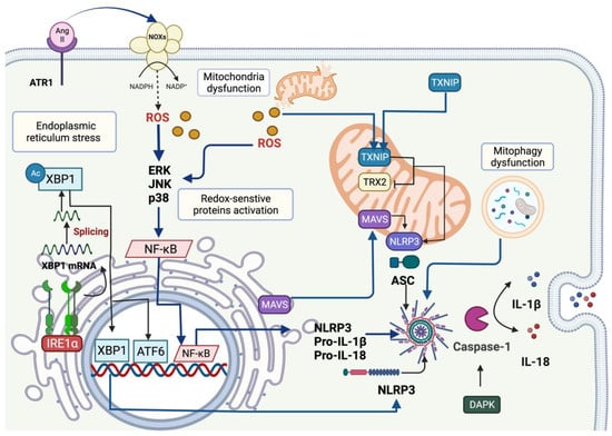 Activation of NOD-like receptor (NLR) family pyrin domain containing 3 (NLRP3) inflammasome mediated by redox-signalling, mitochondria and ER-stress during acute kidney injury (AKI). The binding of angiotensin II (Ang II) to its receptor, the angiotensin receptor 1 (ATR1), triggers ROS overproduction by stimulating NADPH oxidases (NOXs) in the plasmatic membrane. The ROS produced by NOXs induces the activation of the redox-sensitive pathway, including extracellular signal-regulated kinase (ERK), c-Jun N-terminal kinases (JNK) and p38, proteins able to activate to nuclear factor κ-light-chain-enhancer of activated B cells (NF-κB). The latter promotes the transcription of target genes such as NLRP3, pro-interleukin 1 β (IL-1β) and pro-interleukin 18 (IL-18). Under mitochondrial dysfunction, ROS are also generated, named mitochondrial ROS (mtROS), which activates the priming steps of inflammasome mediated by the redox-sensitive proteins. Further, excessive mtROS leads to the translocation of thioredoxin-interacting protein (TXNIP) from the cytosol to the mitochondria. In mitochondria, TXNIP interacts with thioredoxin 2 (TRX2), inhibiting its activity, promoting the interaction with NLRP3 protein. Moreover, mitochondrial antiviral signalling protein (MAVS), an adaptor protein, is involved in NLRP3 localization in the mitochondria and participates in the inflammasome formation by promoting this interaction with apoptosis-associated speck-like protein containing a CARD (ASC). High levels of mtROS activate mitophagy, a negative regulator of inflammasome; however, in the case of AKI, mitophagy is dysfunctional, contributing to NLRP3 inflammasome activation. Another protein that activates inflammasome is death-associated protein kinase (DAPK), which activates caspase-1. On the other hand, the endoplasmic stress reticulum produces ROS and triggers unfolded protein response (UPR), recognized as an inductor of the inflammasome. Figure created using BioRender (Toronto, ON, Canada).