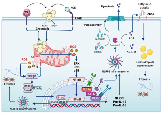 Previous reports in DN showed that the increase of triglycerides, inducing lipotoxicity and later kidney damage is related to fibrosis onset [272]. In this regard, the activation of NLRP3 also promotes lipid accumulation, as was recently demonstrated by Wu et al. [273]. These authors reported that diabetic mice increased lipid deposition via IL-1β/ROS/NF-κB p65, triggering NLRP3 priming, which induces the upregulation of sterol regulatory element-binding protein 1 (SREBP1) and 2 (SREBP2). The latter proteins are involved in lipid biosynthesis. Moreover, the ATP-binding cassette transporter (ABCA1), a protein implicated in the transport of phospholipids, cholesterol, and other metabolites from cells to lipid-depleted HDL apolipoproteins, decreases [273,274]. The knockout of NLPR3 avoids inflammation and fibrosis by reducing lipid deposition, suggesting the involvement of NLPR3 to induce lipid accumulation [273]. Moreover, lipid deposition via inflammasome activation has been attributed to the upregulation of IL-1β, which stimulates the cluster of differentiation 36 (CD36) to mediate fatty acid uptake [275,276].