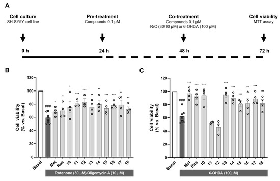Cells were seeded at a density of 60,000 cells/well in 96-well transparent plates for 24 h. Then cells were pre-incubated with the corresponding compound at 0.1 μM. After 24 h, the medium was removed and replaced with 1% (v/v) FBS media containing the corresponding compound at 0.1 µM and the selected toxic stimuli, namely a mixture of rotenone and oligomycin A (R/O; 30/10 μM, respectively; Sigma–Aldrich, Spain) or 6-hydroxydopamine (100 µM; Sigma–Aldrich, Spain). The co-incubation of toxic stimuli plus compounds was maintained for 24 h. Melatonin and rasagiline were used as references for comparative purposes. After the co-incubation period, cell viability was assessed by the 3-(4,5-dimethylthiazol-2-yl)-2,5-diphenyltetrazolium bromide (MTT) method considering basal conditions as 100% survival.